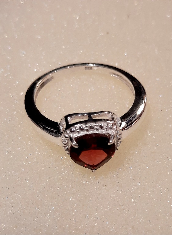 Bague en argent sterling 9.25 avec une pierre de grenat en forme de coeur.