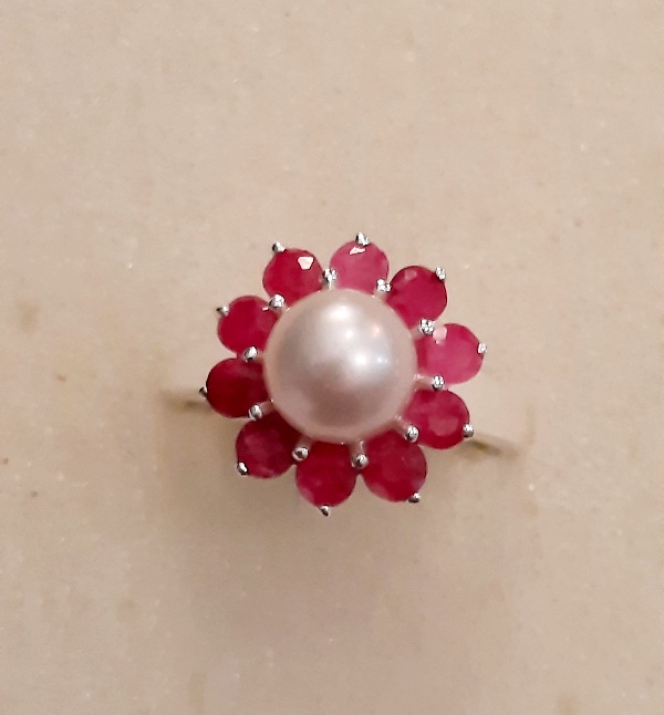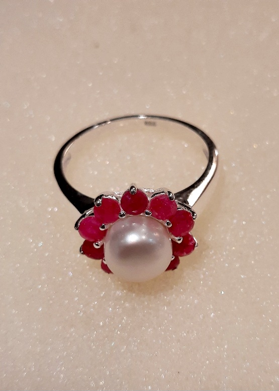 Bague en argent sterling 9.25 avec des pierres de rubis et une perle.